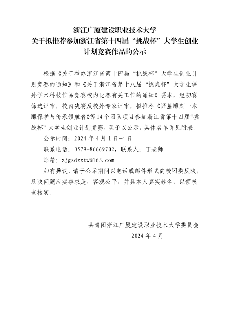 关于拟推荐参加浙江省第十四届“挑战杯”大学生创业计划竞赛作品的公示
