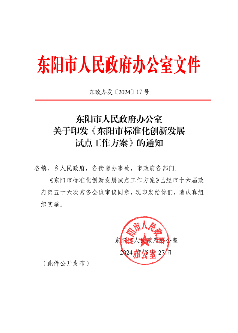 关于转发 《东阳市人民政府办公室 关于印发<东阳市标准化创新发展 试点工作方案>的通知》的通知